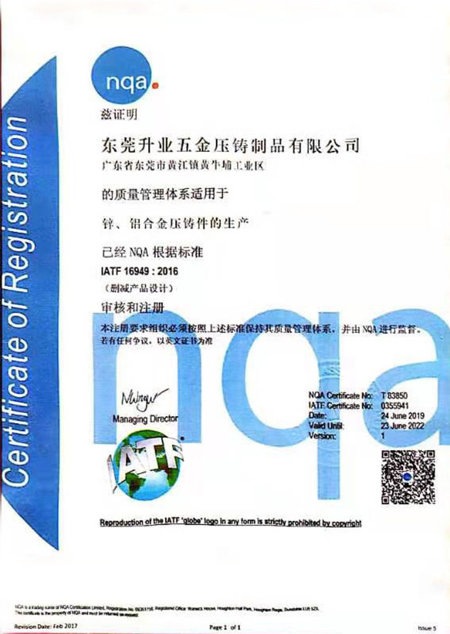 Sheng Ye Diecasting Industries Co., Ltd. Passed IATF 16949:2016 certification.